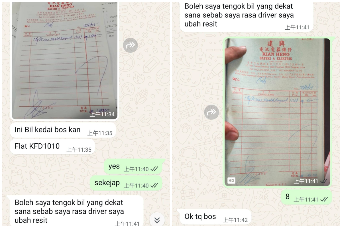 Lee Wei shared with Noodou that this incident took place in May. A lorry driver came to his workshop to replace a single light bulb priced at RM8, and was issued a handwritten receipt accordingly. Fast forward 2 months to July, someone from the company’s finance department called the workshop. It is obvious that when the driver submitted an expense claim listing the cost as RM180, alarm bells rang. Something clearly did not add up, and to get to the bottom of things, the finance staff reached out directly to the workshop to verify the charge. That call led to a dramatic discovery.