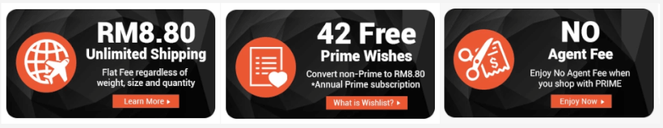 Look up to the latest offers when you can enjoy more discounts on shipping, delivery and even agents fees. Search your favorite items all around the world without hesitations as you can enjoy the best shipping price by joining the PRIME Family. You can shop as much as you can and pay only RM8.80 on INTERNATIONAL SHIPPING for all the BIG, BULKY and HEAVY items!